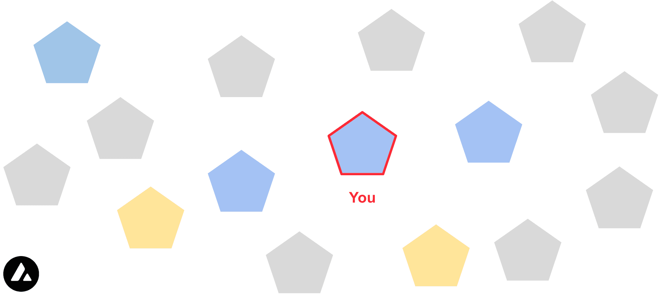Let's visualize this with an example. You are a validator in a set of validators that is performing the Avalanche Consensus protocol to agree on whether to send the funds to Charlie (yellow) or to Bob (blue). It is important to understand that none of the validators really cares whether it is going to be yellow or blue, as long as all correctly operating validators decide for the same outcome at the end of the process. The starting preference is chosen randomly by each validator.