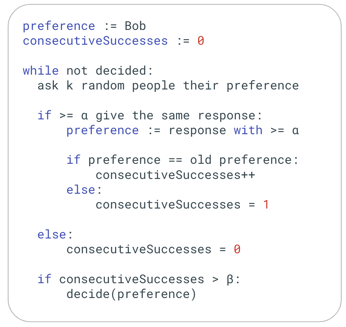 Now you query another five validators for their preference. Again, three of the five reply with the preference blue (Bob). Since your current preference is confirmed, you increment a counter for consecutive successes by one. You repeat this sampling process until their preference is confirmed for 8 consecutive rounds.