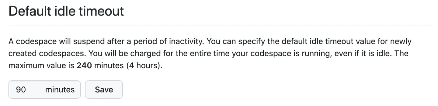By default, Codespaces will pause after 30 minutes of inactivity. You can extend this period to up to 4 hours to avoid frequent pauses during development.